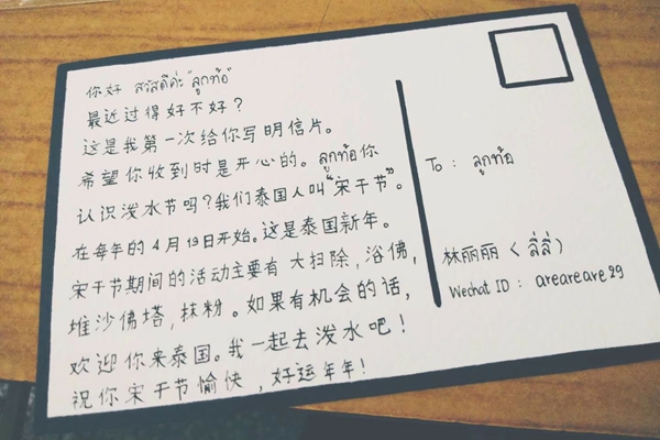 开学第一天,每位同学怀揣着希望为一个新的梦想启航,泰语专业学子在走进教室的那一刻,他们的语言梦被外教带来的精美礼物和明信片点燃了,这些别具风格的礼物和写满祝福的明信片是普吉皇家大学交际汉语系学子精心准备的。一幅幅美丽的画、一行行工整的汉语和泰语镶嵌着两国学子深深的情谊与愿望,他们互加微信,找到自己语伴,结对帮扶、互助发展,共同进步,开辟了新的语言学习之路。