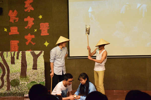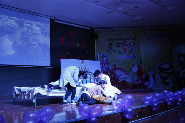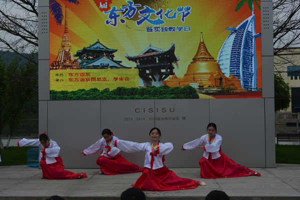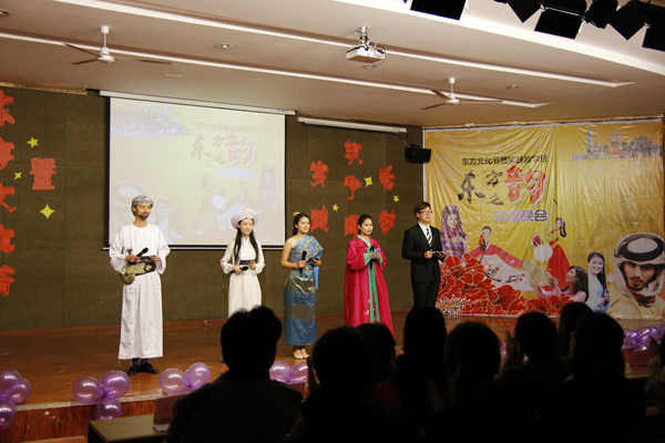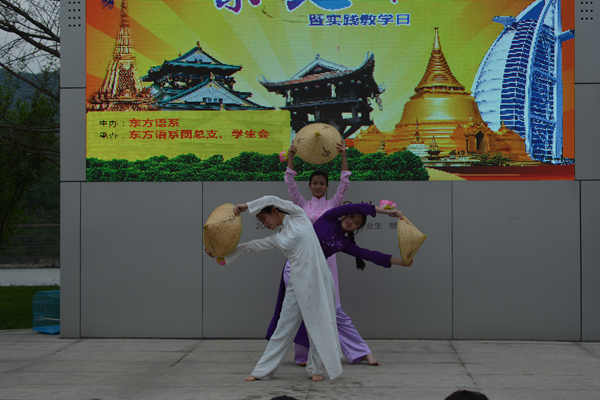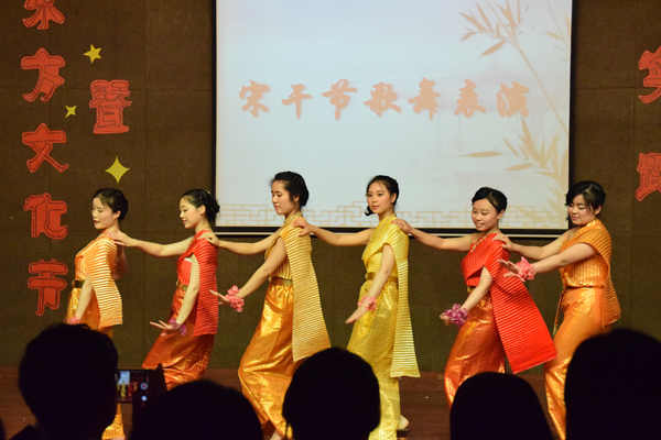 实践教学日当晚,我系于一教C201举办东方之韵外语晚会。此次晚会采用别样的主持方式,以我系四语种外加中文的主持独特开场。此次晚会以越南的特色舞蹈拉开序幕,为我们展现了纯净柔情的越南民族风韵。随后,朝鲜语第 5 组带来的《最好吃的饭》在感动中讴歌了母爱的伟大。泰语专业的《我们都一样》讲述了一个医生救人不幸感染艾滋病的故事,呼吁人们要关爱艾滋病人。而朝鲜语第二组带来的《不一样的白雪公主》则是由悲到喜的转换,美丽的白雪公主,恶毒的王后,滑稽的魔镜带来的表演让观众们捧腹大笑。阿拉伯语 2 班带来的《怯》以每个人心中的胆怯懦弱为题,给予我们突破胆怯坚持心中所想的教育意义。朝鲜语歌曲《你的意义》唱出来年轻学子的青春与活力,将晚会推向了另一个高潮。越南语专业的《守望》和阿拉伯语1班的《活着》分别表达了对迟迟不能归家的军人的守望和在战乱中活着的渴望,同时表达了人民渴望和平的愿望。接下来朝鲜语第1组带来的《大妈的援助》讲述了大妈好心救鹿却弄巧成拙,但却告诉我们别人有困难时要热心帮助他人。朝鲜语第 4 组带来的《七号房的礼物》让我们重温电影情节,精彩的表演让人感动。最后晚会在泰语的宋干节舞蹈中落下帷幕。