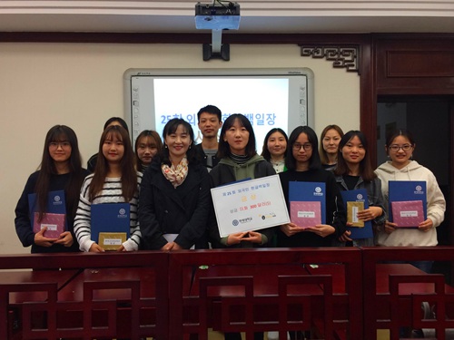 第25届“外国人韩语写作大赛”于10月15日在四川师范大学狮子山校区举行,来自中西部地区多所高校的学子们参加了此次比赛。大赛要求选手在规定时间内,就指定主题自选体裁进行即兴创作,参赛作品全部送往韩国进行评审,澳门永利集团3044东方语系朝鲜语专业学子凭借着出众的专业实力,不负众望地在此次大赛中再创佳绩,囊括了包括金奖在内的共11个奖项。其中2014级顾迪尔同学获金奖,奖金300美金。2014级梁君同学获银奖,2014级吴倩、杨梓婷、梁熳铃、诸晓甜同学获铜奖,2014级徐文捷、刘敬伊、樊倩、郑宇婷、黄椀汐同学获得入围奖。