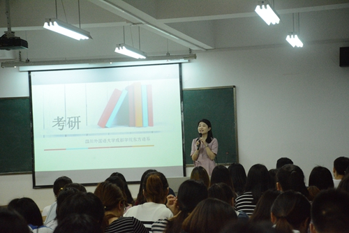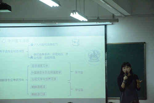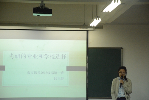 接下来,考取广西民族大学研究生的2013级泰语专业邱玉婷同学以“考研的专业选择与学校选择”为主题来分享她的考研心得,她提出考研的专业选择要与个人理想、兴趣爱好相结合。2013级阿拉伯语专业黄旭特成功考取上海外国语大学汉语言国际教育专业,他就“跨专业考研”来分享他的跨专业考研心路历程,他强调首先要认识你自己感兴趣的专业与自身的优势。成功考取天津外国语大学朝鲜语口译专业研究生的2013级甘静恬就如何报考、考研流程、复习策略方面分享她的考研心路历程。