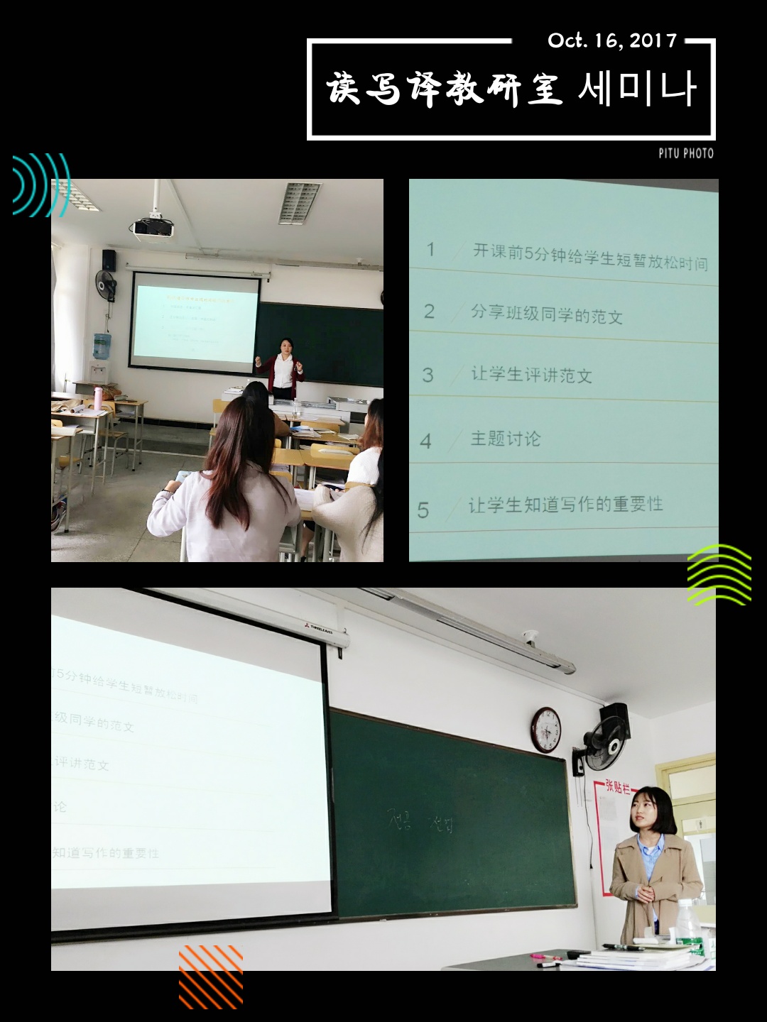 10月16日下午三点, 我系朝鲜语专业读写译教研室教师集体备课活动于一教B401教室如期展开。本次集体备课会的主题为如何更加有效地提高学生的专业写作能力,主要由金艳玲和杨扬两位老师负责,而参与此次活动的为读写译教研室全体教师,包括担任写作,阅读,口、笔译课程的所有老师。