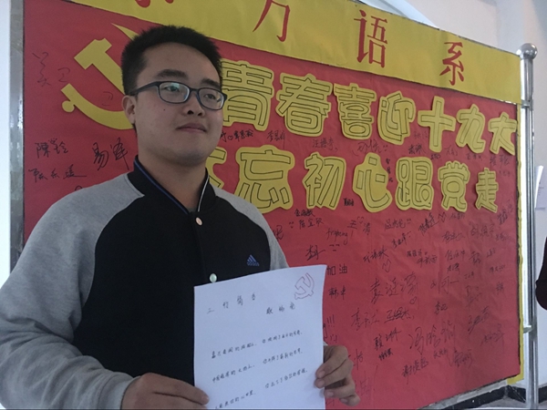 在中国共产党十九大胜利召开之际,我系学生党员认真学习领会十九大报告精神,并开展了形式多样的十九大精神的宣传和学习活动,10月24日,我系在一教A201组织开展了全系党员党组织生活,共同学习领会会议精神,我系学生党支部发起“三行情诗献给党”征集活动,并借助新媒体、新形式,以此庆祝党的十九大顺利召开,并在活动后进行深入讨论。