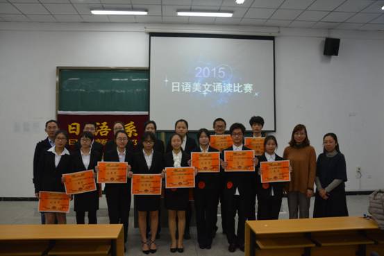 美文润心灵,朗读诵风采。为培养人文素养,提高学生学习日语的热情和积极性。我系于2015年11月17日下午4点30分在二教A座阶梯教室九举办了日语美文诵读比赛。此次比赛的参赛选手为二年级学生。日语系主任管静、主任助理陈强、团总支书记马蕾出席了本次比赛。专业教师韩晶子、孙南、孙耀宇以及外籍教师森本晃子担任本次比赛评委。