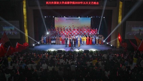 27日晚,元旦文艺晚会在观澜堂举行。四川外国语大学、成实外教育有限公司、都江堰市的相关领导和嘉宾应邀出席,与我校师生一起欢庆元旦佳节。