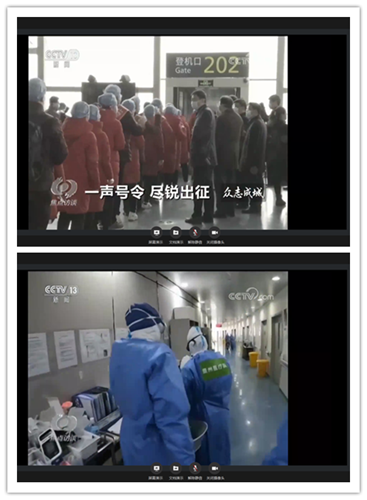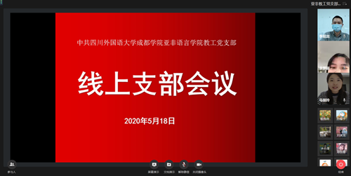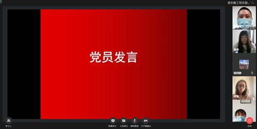 会议以视频方式召开,首先观看视频——焦点访谈《众志成城 一声号令 尽锐出征》。接下来,党员教师们结合学校、学院实际,就自身抗疫、在线教学、返校复课等如何发挥带头作用进行发言。刘谋龙、陈虔、李阳龙等同志表示,虽然无法向医护人员一样到一线工作,但是作为一名党员教师,前期做好海外留学生心理疏导和健康打卡,保持必要的沟通交流,体现关心关爱。现阶段更需要发挥模范带头作用,按照学校要求,做好相关返校复课准备;潘曰胜、周蜜等同志疫情期间发挥专业优势,主要为地方政府和行业协会进行本语种新冠肺炎科普知识、宣传片、海外采购合同等翻译。他们表示,作为党员教师,能够为疫情防控尽上一份绵薄之力,感到十分光荣;刘畅同志就在线教学所遇困难,及自身积极转变思维方式等进行发言,面对学生在线教学过程中表现出的种种变化,作为一名党员教师,更需要起好带头作用,监督学生保质保量吸收知识。