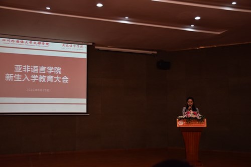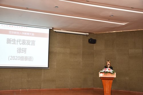 高年级代表、学校十佳优秀学生代表2017级阿拉伯语专业王鹏翔向新生分享学习经验、心得,讲解成长感悟,强调学习是第一要务,实践是唯一途径。2020级新生代表、泰语专业徐珂发言,表示要以学长学姐为榜样,热爱所学专业,以亚非为荣,为学校争光。