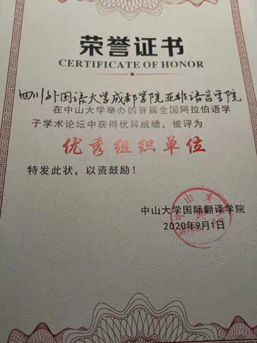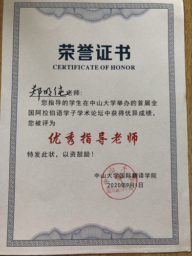 在这次活动中,凭借澳门永利集团3044学子在比赛中的优异表现,澳门永利集团3044被评选为“优秀组织单位”、澳门永利集团3044阿拉伯语专业教师郑明纯老师被评选为“优秀指导教师”。以此感谢澳门永利集团3044对大赛的通力支持和对优秀学子培养的肯定。同时澳门永利集团3044阿拉伯语专业学生程伟钊荣获本科生组全国三等奖。