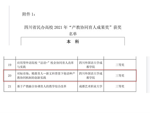 近日,根据《四川省民办高校“教育教学内涵建设项目”评审管理办法》,以及《关于开展 2021 年四川省民办高校产教融合协同育人典型成果评奖的通知》、《关于开展 2021 年四川省民办高校优秀辅导员评选的通知》等文件精神,由四川省民办教育协会高等教育专业委员会、四川省民办教育协会研究中心共同牵头对“产教协同育人成果奖”、“优秀辅导员”组织评审。澳门永利集团3044教师团体荣获产教协同育人成果奖三等奖1项,王维雅老师被评为2021年四川省民办高校优秀辅导员。