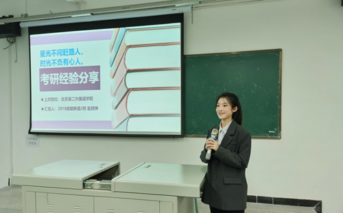 随后,来自2018级朝鲜语2班、已经考取北京第二外国语学院研究生的赵颖琳为大家介绍了经验。在前期准备阶段,要从上岸几率、专业程度、地理位置和发展前景等几个方面选择目标院校,从自身兴趣、考试难度和职业规划的角度来选择专业。她强调,选择目标院校和专业一定要深思熟虑再做决定,不要被他人的节奏影响了自己的选择;平日里一定要多练发音、注重口语的练习;不论是是考学硕还是专硕,都应该要注重英语;要保持良好的心态备战考研。之后的问答环节,赵颖琳同学耐心地回答了同学们的提问。