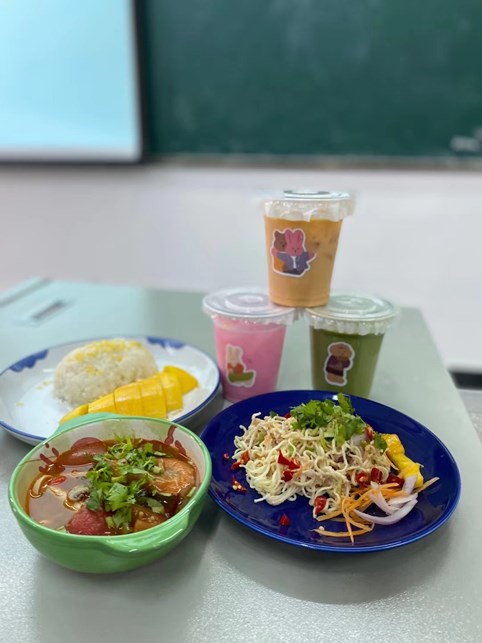 本次活动共做了芒果糯米饭、冬阴功、凉拌方便面、泰式奶茶、粉红奶冻5道菜品。外教老师利用PPT图片为学生介绍每道菜品所需用的食材,配合视频讲解做菜步骤,同学们听得非常认真,并亲自参与制作,看到自己劳动成果出炉的那一瞬间,每个人的脸上都洋溢着成功的喜悦。同学们还将制作过程在抖音平台进行了直播,美味的泰餐吸引力他语种同学前来观看。