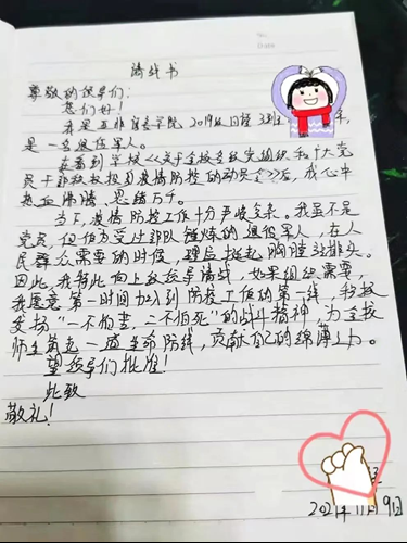 在《请战书》中他写道:在看到学校《关于全校各级党组织和广大党员干部积极投身疫情防控的动员令》后,我心中热血沸腾、思绪万千。当下,疫情防控工作十分严峻复杂,我虽不是党员,但作为受过部队锤炼的退役军人,在人民群众需要的时候,理应挺起胸膛站排头。因此,我特此向上级领导请战,如果组织需要,我愿意第一时间加入到防疫工作的第一线,积极发扬“一不怕苦,二不怕死”的战斗精神,为全校师生筑起一道生命防线,贡献自己的绵薄之力。