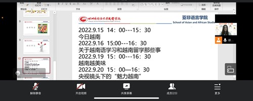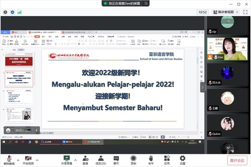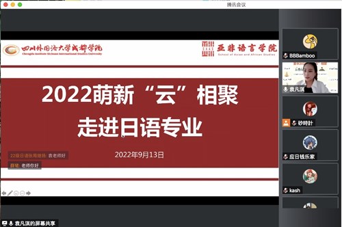 为帮助2022级新生尽快融入大学生活,加深对学院专业学科的认识,扣好大学的第一颗"纽扣",尽快完成身份转换,合理规划职业生涯。9月13日下午 15:00 -- 16:00,澳门永利集团3044日语、朝鲜语、越南语、泰语、阿拉伯语、马来语共六个专业2022级全体新生依托腾讯会议平台聚"云"端,与各语种专业课老师共话今后专业学习。