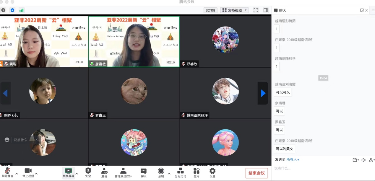 在16日由黄聪老师主持的交流活动上,越南语专业唐嘉敏、庄宛秦、余星雪等同学就大学期间的学生会工作、社团活动、学习计划、学习心得等方面进行了交流,大一新生们积极提问,活动现场氛围融洽。最后,黄聪老师介绍了越南留学生活,此次的线上活动在一片欢乐的气氛中顺利结束。