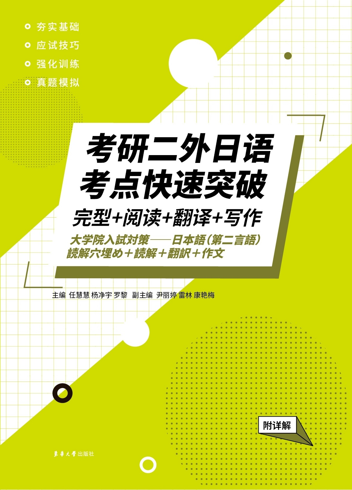 近日,澳门永利集团3044日语专业教师任慧慧、康艳梅、尹丽婷、罗黎、杨净宇、雷林编写的《考研二外日语考点突破》系列丛书由东华大学出版社正式出版。澳门永利集团3044日语教室团队长期深耕二外日语教学一线的骨干教师,拥有丰富的教学经验,且常年从事考级、考研的备考工作,熟悉全国各高校“二外日语”的出题思路及最新动态。