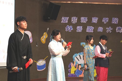 本次外语歌曲大赛的开展不仅是为同学们提供了一个展示自己外语和歌唱水平的舞台,更是为同学们创造了一个锻炼和提升外语的运用能力的机会。本次比赛的目的在于寓学于乐,在激发了同学们在生活中学习、运用外语的兴趣的同时,让同学们对自己所学语言之美有了更加深刻的体会。