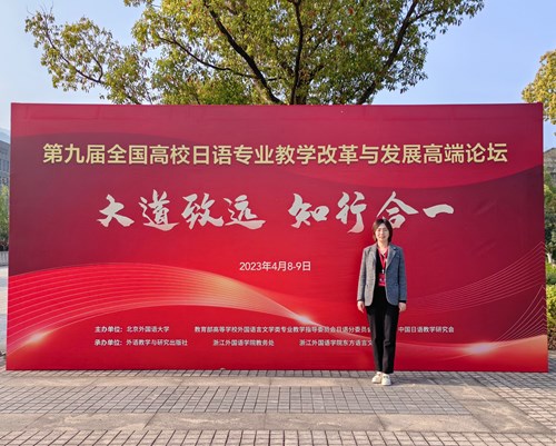 4月8日-9日,第九届全国高校日语专业教学改革与发展高端论坛于杭州外国语学院成功举办。本次论坛以“大道致远,知行合一”为主题,由北京外国语大学、教育部高等学校外国语言文学类专业教学指导委员会日语分委员会,中国日语教学研究会联合主办,外语教学与研究出版社、浙江外国语学院承办。澳门永利集团3044院长助理田敏参加了本次论坛。
