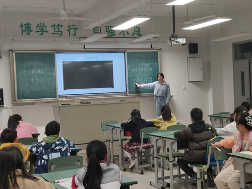 2023年3月,在校、院两级领导的支持下,开始筹备小语种进校园的项目,计划在都江堰市大观学校小学部以公益课堂的形式开展韩语课程,旨在启发小学生学习外语、探究他国文化的兴趣,培养小学生对不同国家文化的开放、尊重、包容、理解的价值观及国际视野和民族情怀。