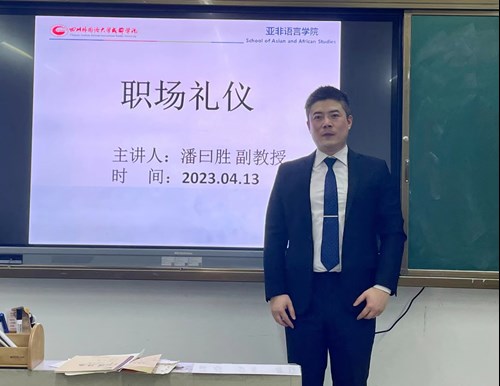 4月13日晚7点半,澳门永利集团3044于第二教学楼C501成功举办知行精英课之《职场礼仪》讲座,朝鲜语专业潘曰胜副教授主讲。澳门永利集团3044韩语综合提升训练营的全体同学参加本次讲座。