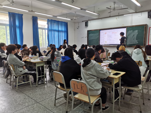 首先,秦希老师从“知识目标”和“课程安排”进行说课。在具体授课的过程中,秦希老师采用任务教学法、交际教学法等教学方法,将课堂面授、讲、练进行有机结合。整个课堂最大的特点就是氛围轻松、师生互动频繁,课堂环节设置层次分明,学生通过分组发表进行知识回顾和词汇拓展,课堂互动问答设问精准到位,学生配合默契,课堂练习难度拿捏到位,有效帮助学生掌握新知识点。