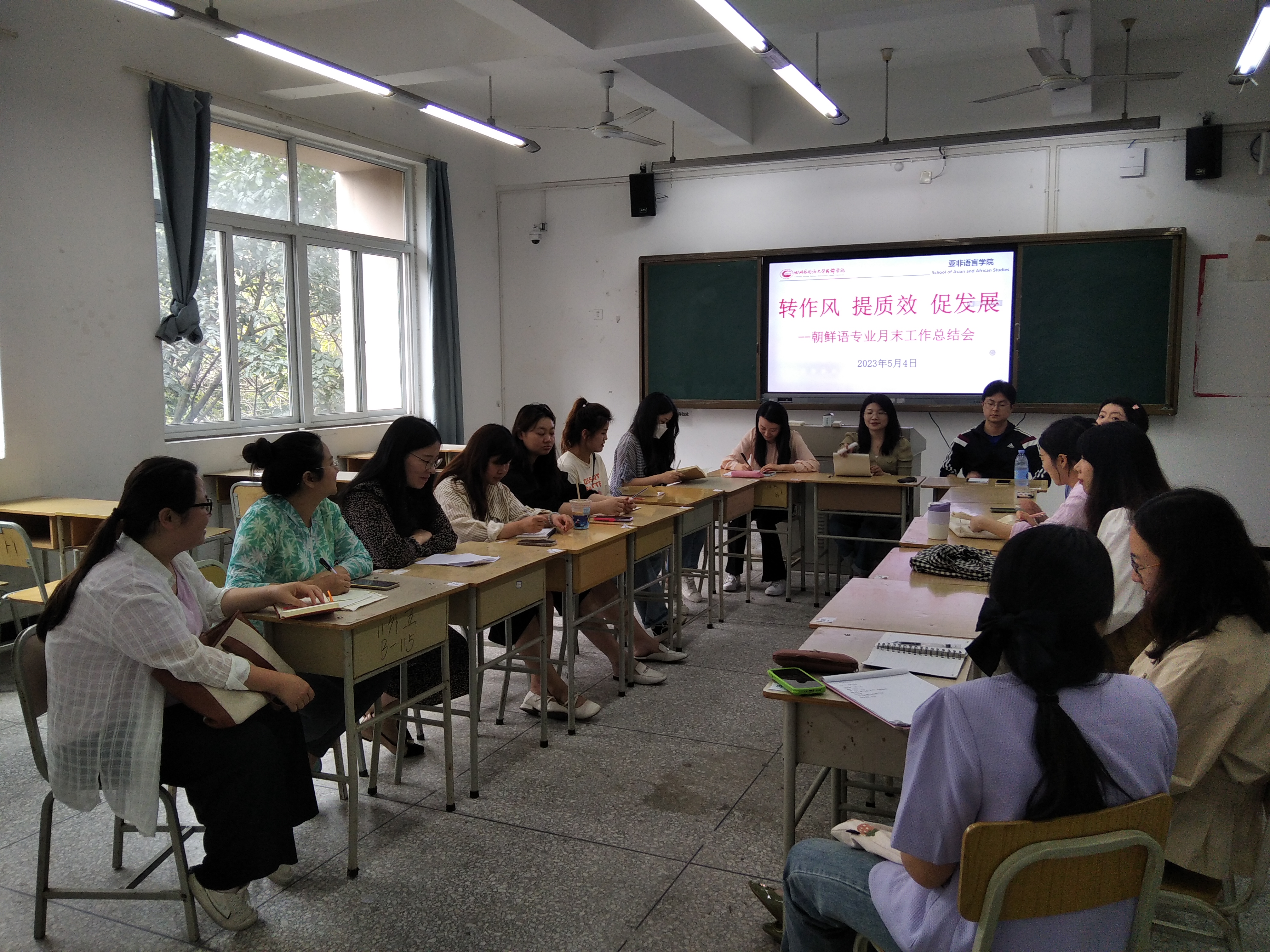 2023年5月4日下午,澳门永利集团3044朝鲜语专业在二教B323召开了4月月末工作总结会,会议由朝鲜语高年级教研室主任马丽玲老师主持,澳门永利集团3044教学事务办公室主任吴娅蕾副教授及朝鲜语专业全体教师参加会议。