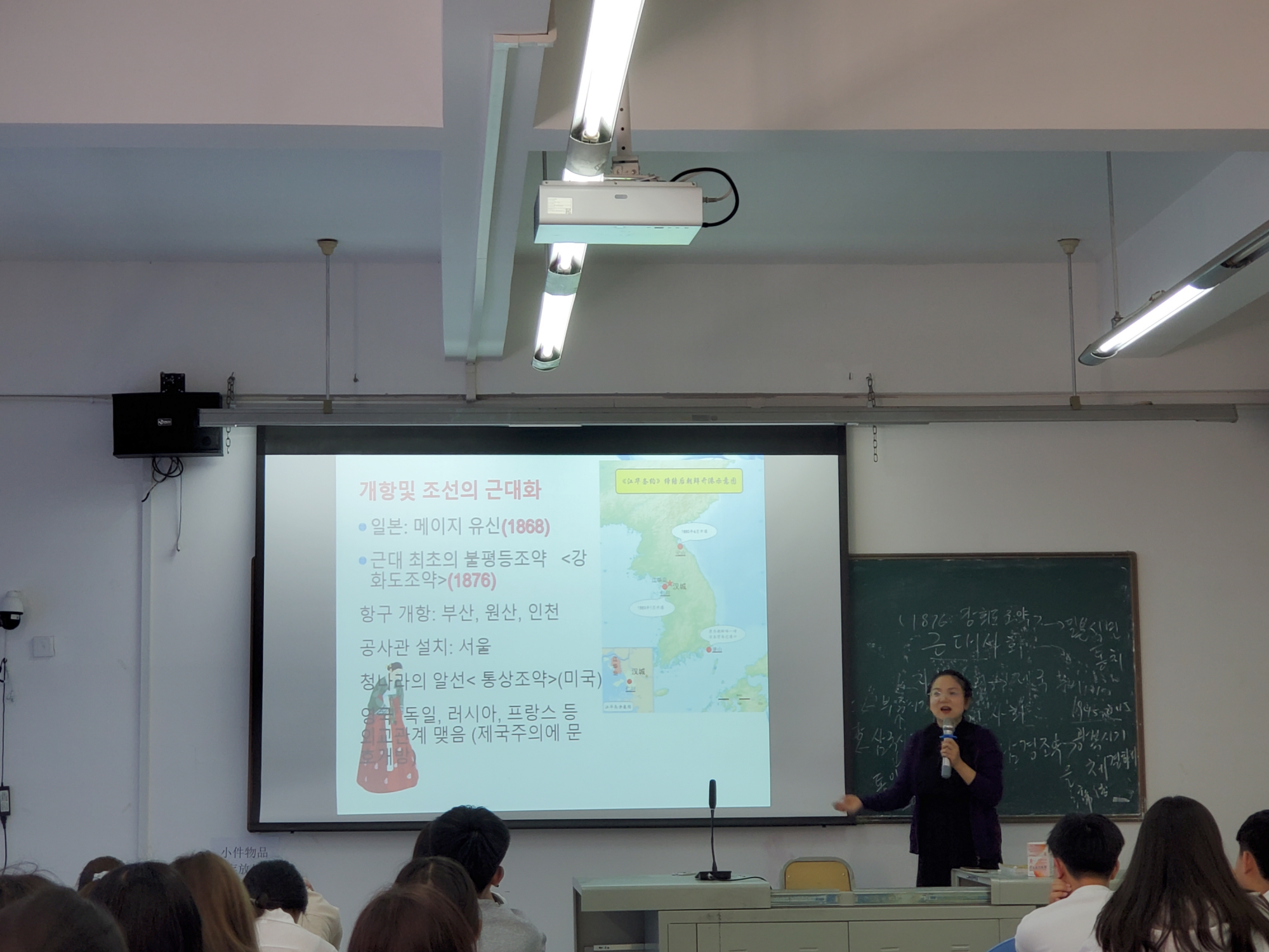 5月16日上午,张婷老师将课程思政融入课堂,在讲解半岛近代史部分内容时,引入中国近代史进行横向对比,加深了学生对该部分知识的理解,同时培养了学生的家国情怀。5月16日下午,郑东雪老师在讲解半岛古代历史部分时,使用丰富的多媒体材料作为补充,并结合当下时事热点,使学生对所学知识有了一个较为全面立体的认识。公开课展示后,全体教师还针对该门课程的思政建设、授课目标、授课模式、授课环节等开展研讨,有效提高了朝鲜语专业教师的业务水平。(供稿:李旋)