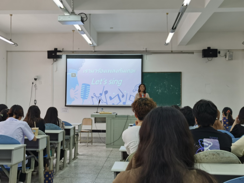 活动过程中,外教玮琳老师将会场内学生分成四组,分选四首不同的泰语歌曲进行泰语歌曲教学,在场学生积极参与,现场纪律良好、教学氛围轻松。经过短暂练习,各组进行了泰语歌唱展示,现场气氛活跃,教学效果优良。