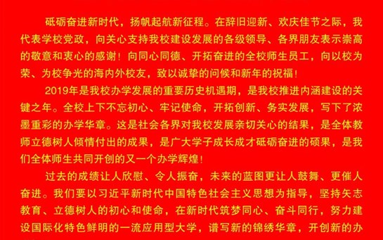 砥砺奋进新时代,扬帆起航新征程。12月26日,我校举行了“筑梦同心、奋斗同行”元旦庆典活动,师生们欢庆元旦、喜迎新年,校园氛围热烈而温馨。为了喜迎佳节,师生们精心布置,在校园里营造了浓郁的节日气氛。博学广场的主题展板回顾了学校2019年主要工作和突出成绩,15门外语的“新年快乐”展板和横幅传递着真挚的祝福,观澜堂、南湖...